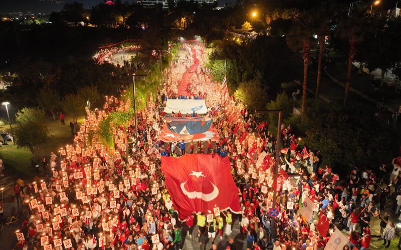 Konyaaltı Varyant'ta toplanan kalabalık yürüyüş güzergahını doldurdu. Antalya Valisi Hulusi Şahin, Büyükşehir Belediye Başkan Vekili Büşra Dirgen Özdemir, sivil toplum kuruluşlarının temsilcileri ve yüzlerce vatandaşın katıldığı yürüyüşte 400 metrelik dev Türk bayrağı taşındı.