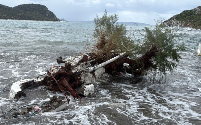 Muğla’nın Bodrum ilçesinde gece saatlerinde etkisini artıran fırtına, yarımadanın batı ve kuzey kesimlerinde ağır hasara yol açtı. Yalıkavak Mahallesi’nde yaklaşık 10 metre uzunluğundaki bir reklam panosu devrilirken, Gümüşlük Mahallesi sahil hattındaki işletmeler dev dalgaların ve şiddetli rüzgarın hedefi oldu.