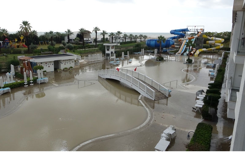 Manavgat ilçesinde sabah saatlerinde etkili olan sağanak yağış, olumsuzlukları beraberinde getirdi. Gündoğdu turizm bölgesinde faaliyet gösteren 5 yıldızlı Diamond De Luxe Hotel & Spa'nın başta havuz bölümü olmak üzere, zemin katta bulunan restoran, hamam, spa, mutfak, soğuk hava deposu, jeneratör ve işletmeleri sular altında kaldı.