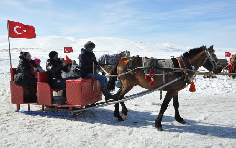 Buz kalınlığının güvenli seviye olan 70 santimetreye ulaşmasıyla birlikte, çivili nalları sayesinde buzda kaymadan ilerleyen atlar, arkalarındaki kızaklarla turistleri gölün derinliklerine doğru eşsiz bir yolculuğa çıkarıyor. Adrenalin sevenler için zaman zaman dörtnala koşturulan atlar, izleyenlere adeta görsel bir şölen sunuyor.