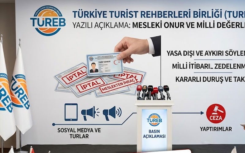 Turist Rehberleri Birliği (TUREB), bazı rehberlerin sosyal medya ve turlar sırasındaki ifadelerine ilişkin sert bir açıklama yayımladı. Yapılan duyuruda, Türkiye’nin itibarını zedeleyen ve milli değerlere aykırı hareket eden rehberlerin meslekten çıkarılacağı vurgulandı.