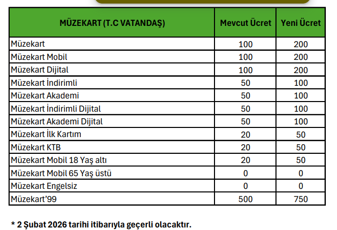 Mevcut ekonomik koşullar dikkate alınarak yapılan düzenleme, 16.01.2026 tarihli ve 11 sayılı Yönetim Kurulu Kararı ile kabul edildi. Yeni Müzekart ücret tarifesi, 2 Şubat 2026tarihinden itibaren geçerli olacak.