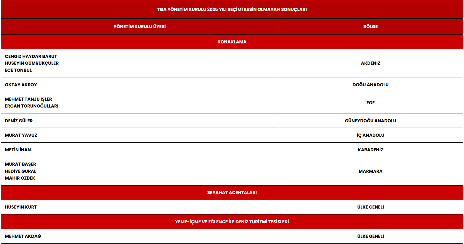 Seçimler sonucunda TÜRSAB temsilcisi olarak Hüseyin Kurt TGA yönetiminde yer aldı. Akdeniz Bölgesi otellerini temsilen Cengiz Haydar Barut, Hüseyin Gümrükçüler ve Ece Tonbul seçilirken, Marmara Bölgesi otelleri Murat Başer, Hediye Güral Gür ve Mahir Özbek ile temsil edilecek.