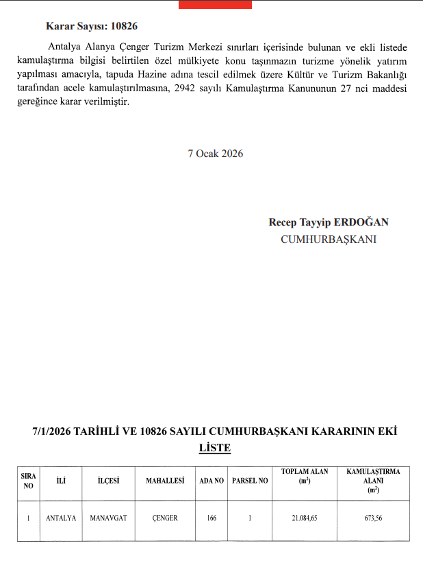 Antalya’nın Alanya ilçesi sınırları içerisinde yer alan Çenger Turizm Merkezi’nde, turizm yatırımlarına yönelik acele kamulaştırma yapılmasına karar verildi. Cumhurbaşkanı Recep Tayyip Erdoğan’ın imzasıyla alınan 10826 sayılı Cumhurbaşkanı Kararı, 7 Ocak 2026 tarihli Resmi Gazete’de yayımlanarak yürürlüğe girdi.